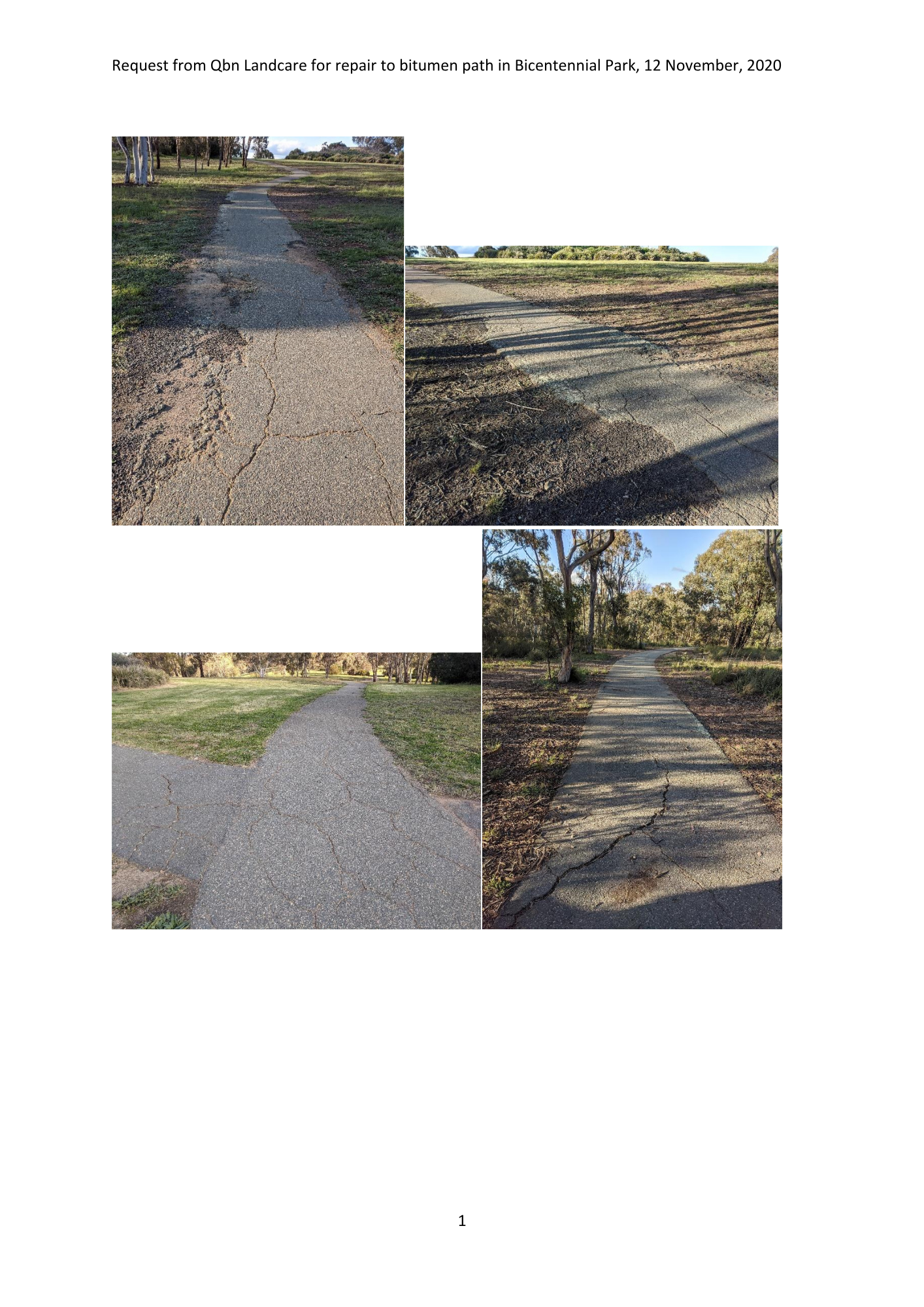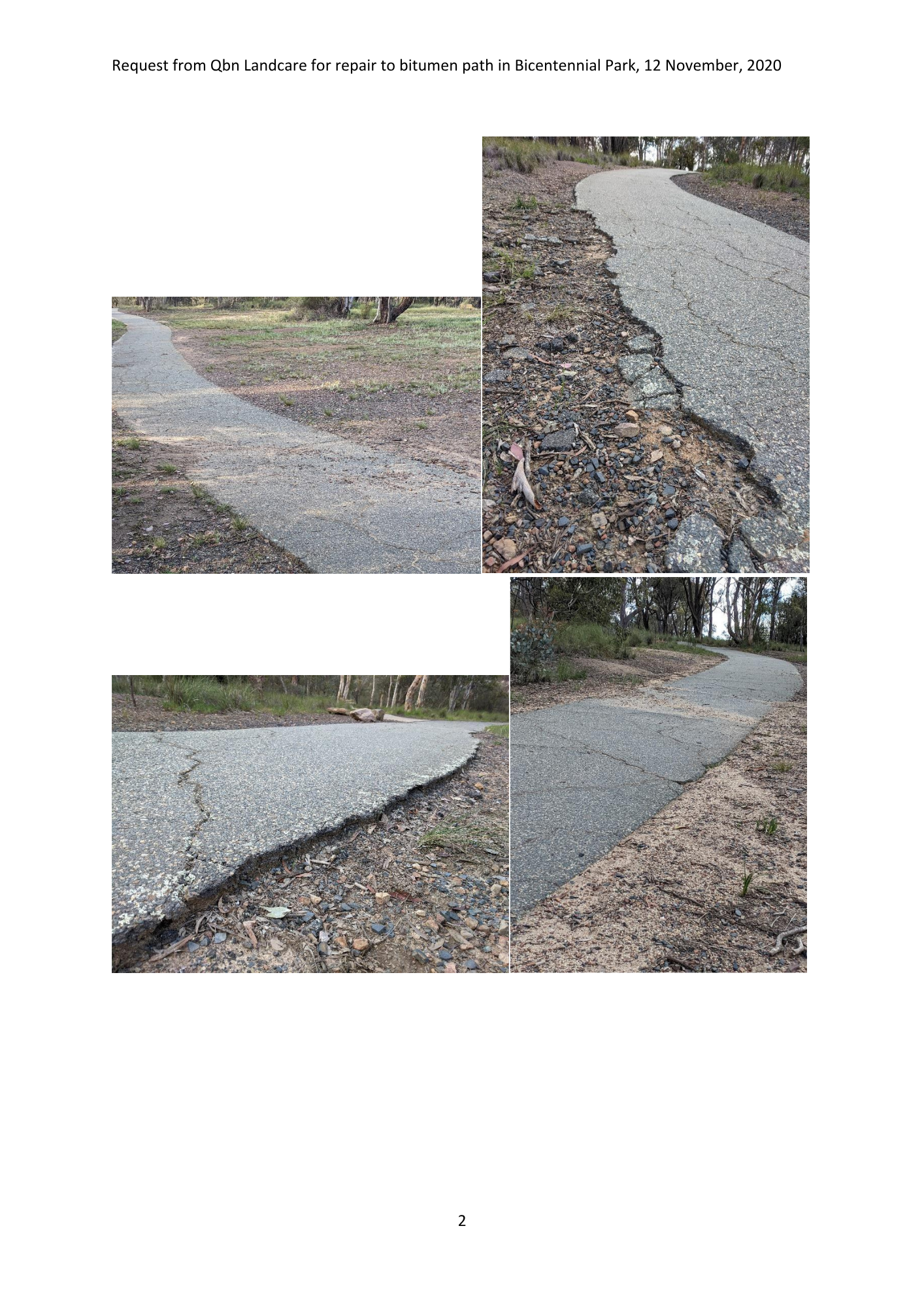 We continued to seek help from QPRC about the many issues facing Bicentennial Park especially the control of African Love Grass and damage to the bitumen paths.