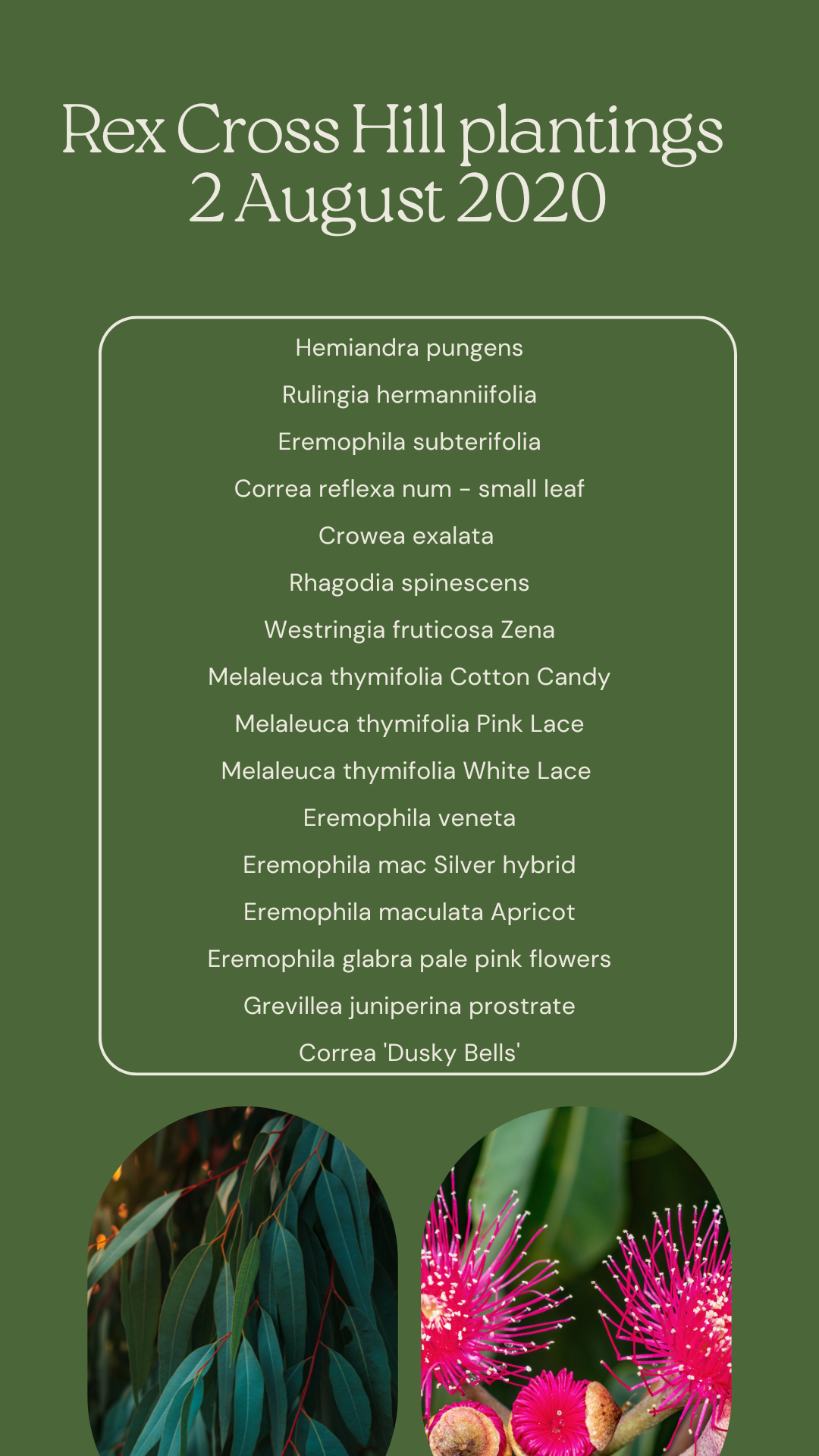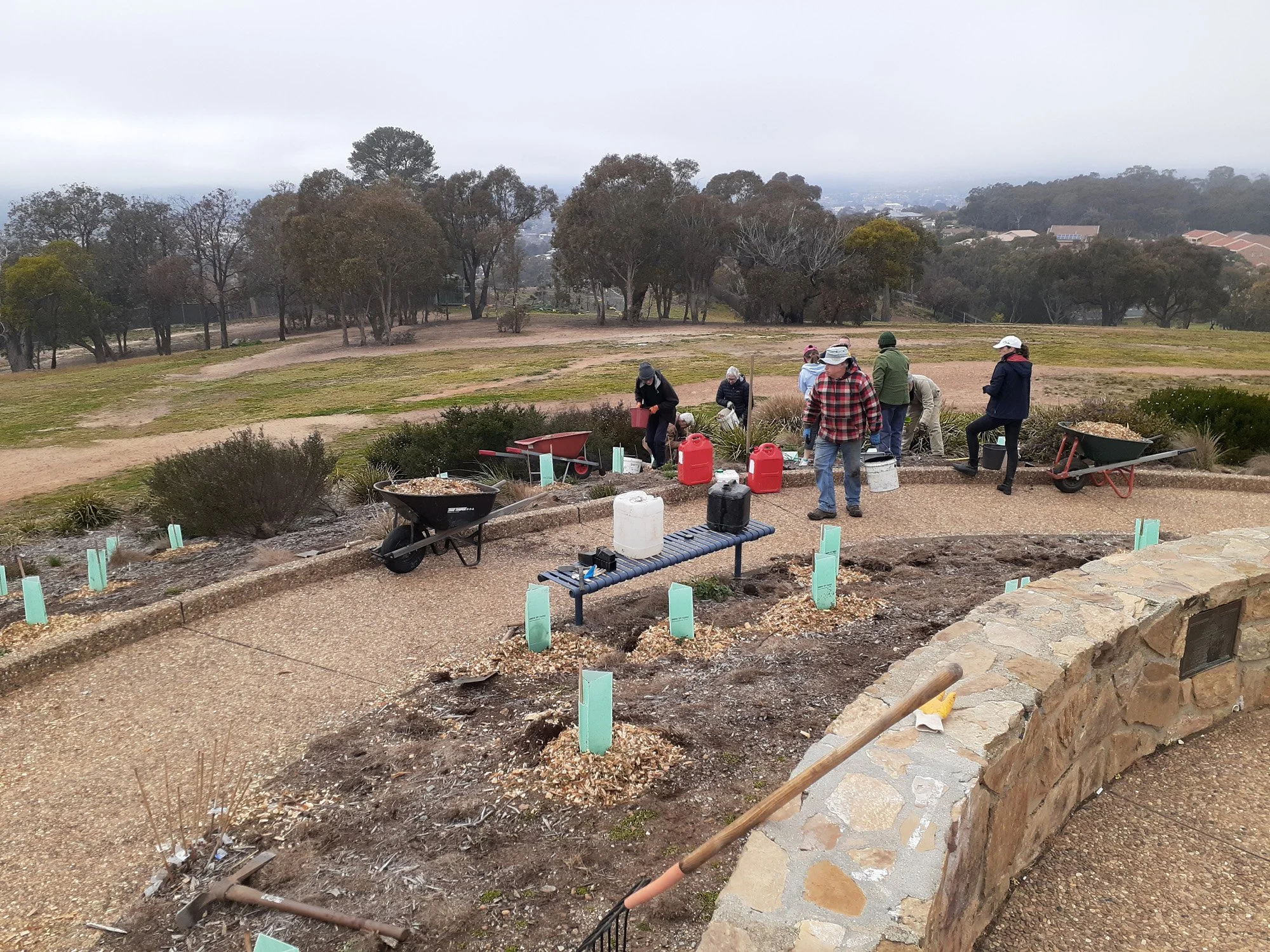 Helen Hadobas reported the planting was held at Rex Cross Hill on 2 August 2020. The purpose of the event was to renew the garden that was planted 5 years ago, where the drought had damaged or killed many plants. As well, incursions by people on foot and on bikes had caused a lot of the mulch that was put down 5 years ago to slip to the bottom of the hill, along with much of the soil. Our aim was to put in new plants that could tolerate the dry conditions on the N/NW side of the hill and to discourage people from walking and riding on the garden bed.