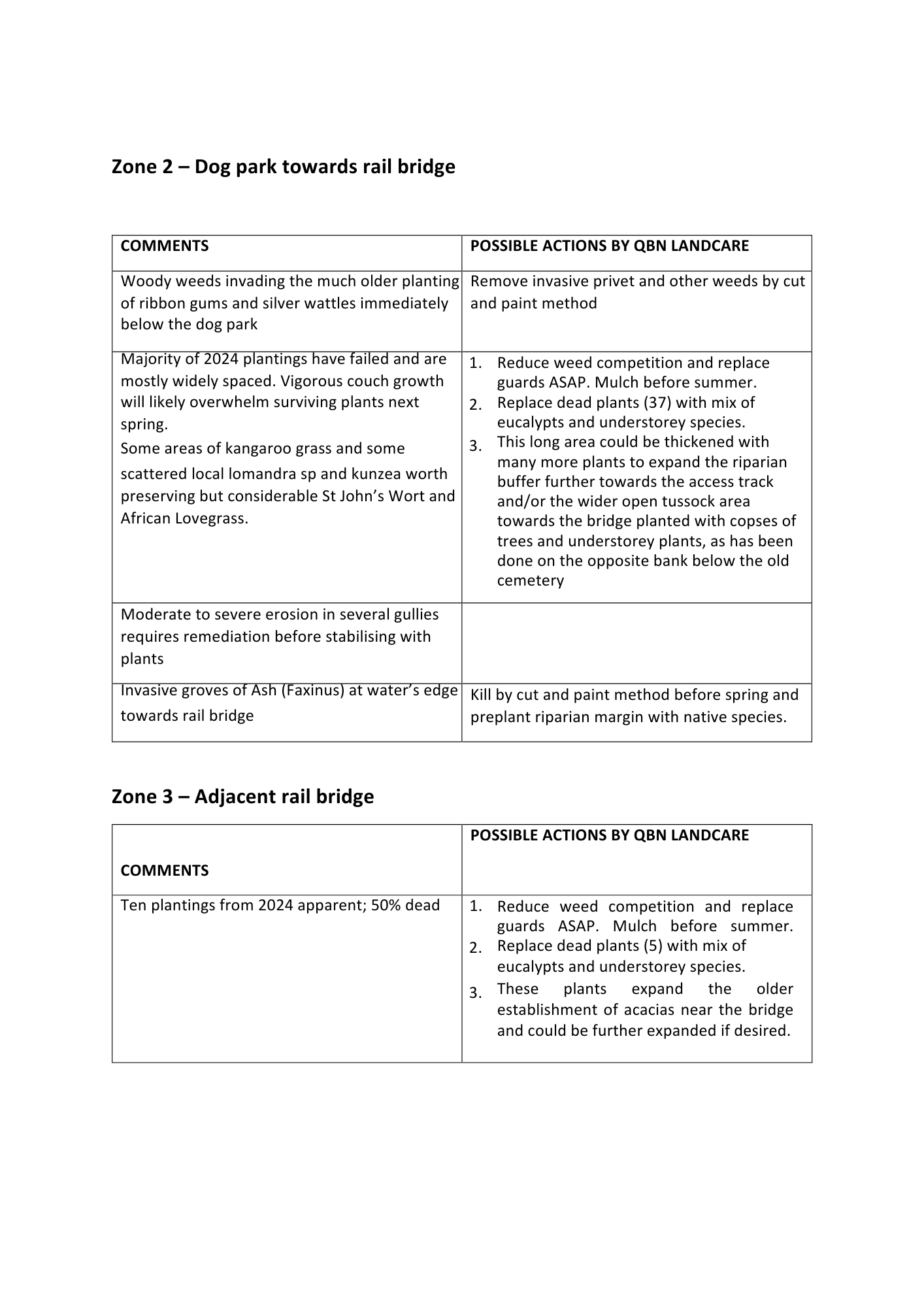 Zone 2 & 3 – Access is via a locked gate next to the dog park off High Street which involves contact with Council for permission to bring vehicles in. Zone 2 are those plants located along the track well away from the river. Zone 3 starts closer to the Railway Bridge as the plantings start to stretch out from the track down to the river. Initially dead plants were removed and new stock planted in the spaces. Tree guards were fixed or replaced.