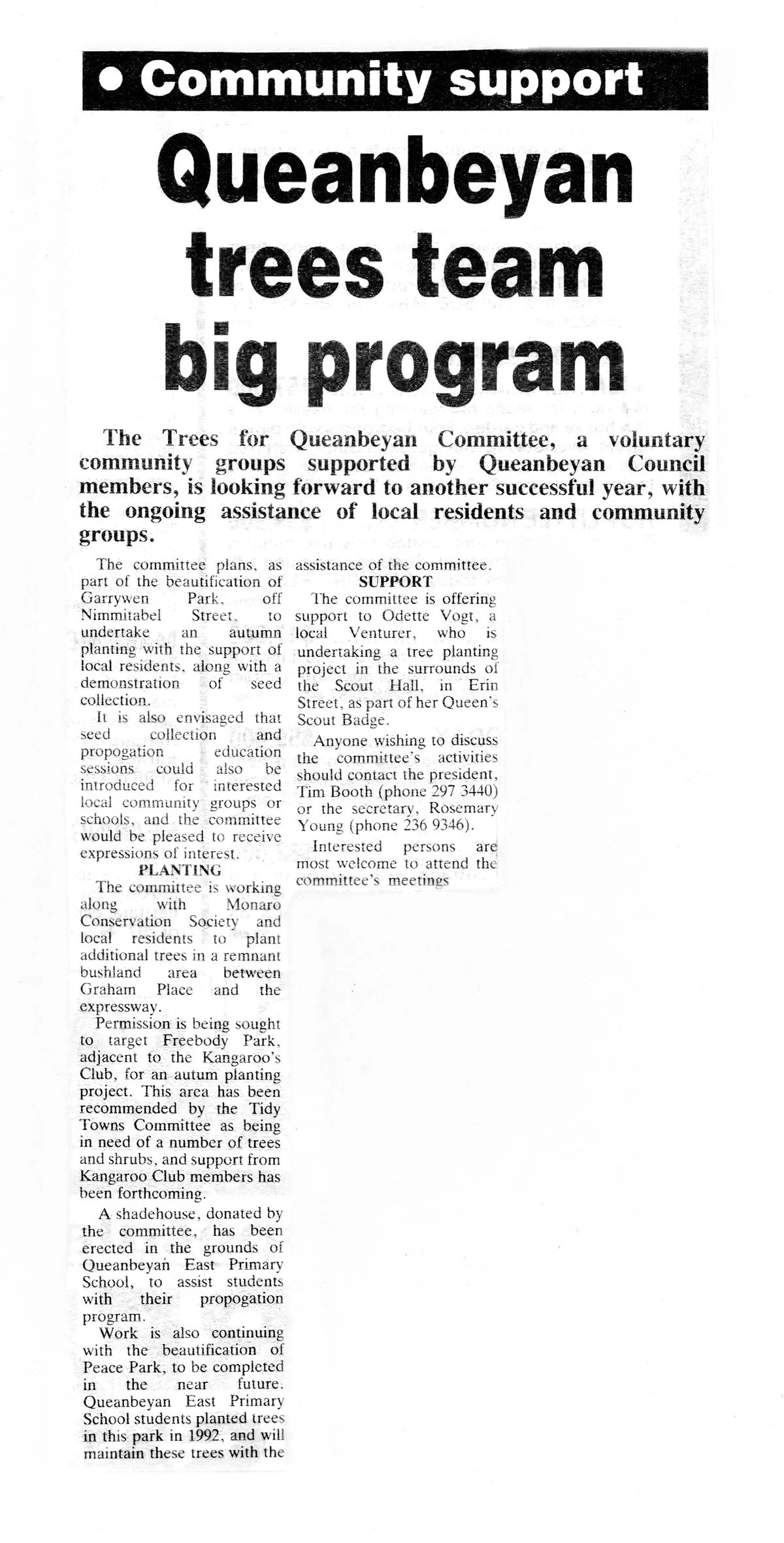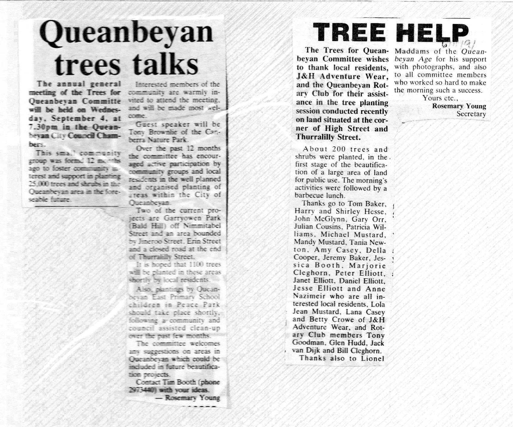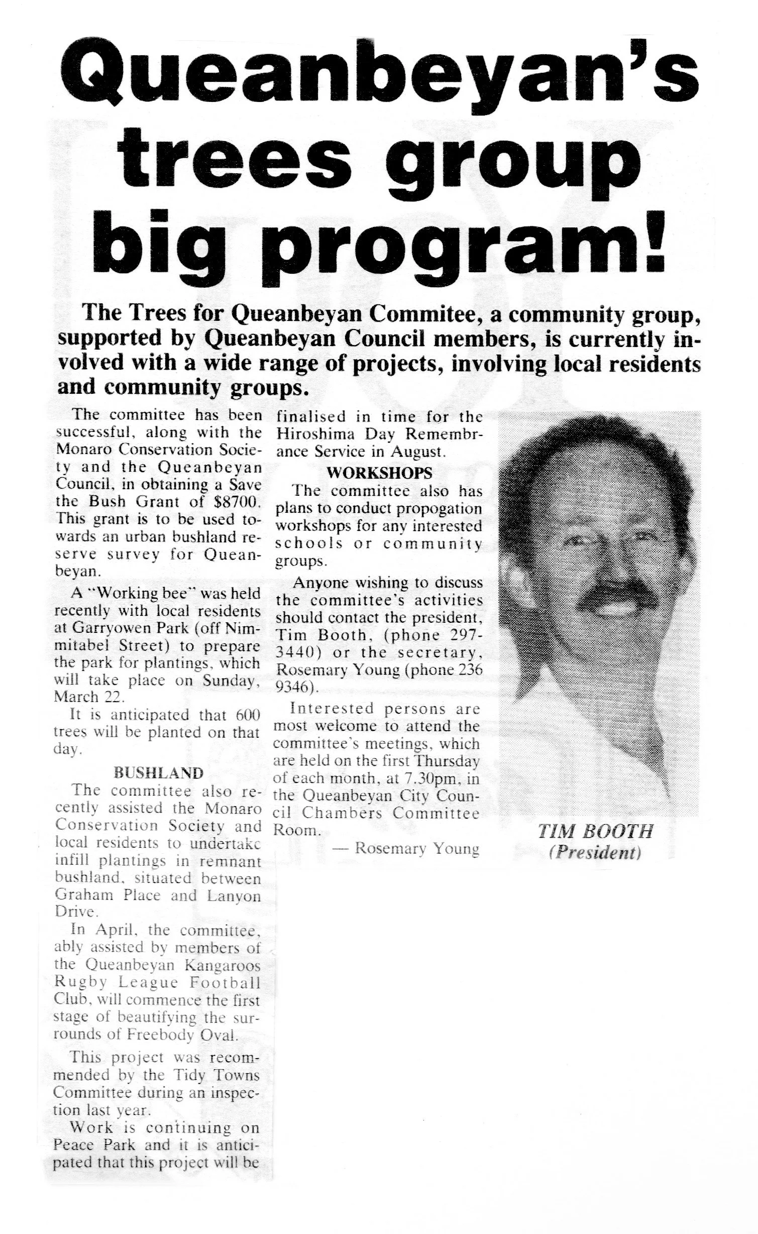 Trees for Queanbeyan provided advice on species, landscaping, relevant regulations and assisted with planning and provided plants and materials. It raised funds for tree planting projects through Trivia Nights where local businesses and people donated prizes. It was also involved with seed collection, propagation and sales and education, erecting a shade house at Queanbeyan East Public School to assist students with their propagation. There was also a Schools Bush Garden project and a scheme whereby free native trees or shrubs were to be given away to the first 50 business houses in Queanbeyan industrial areas who indicated their acceptance. It was at this time that Tim Booth had a regular section in the local paper.
