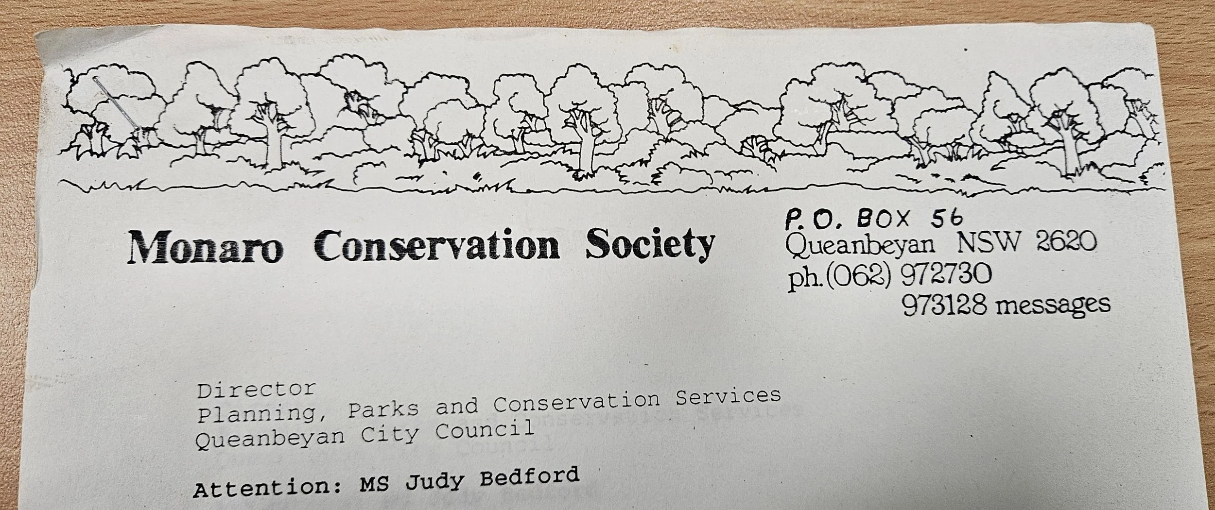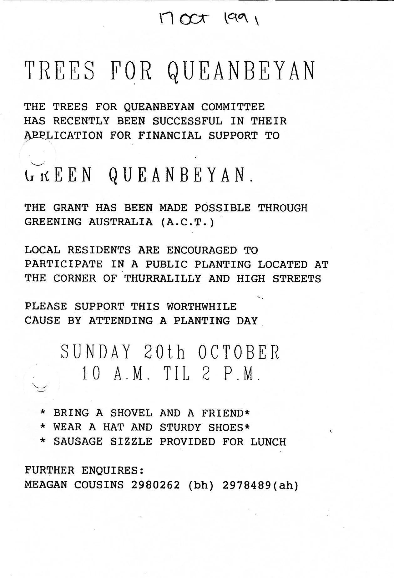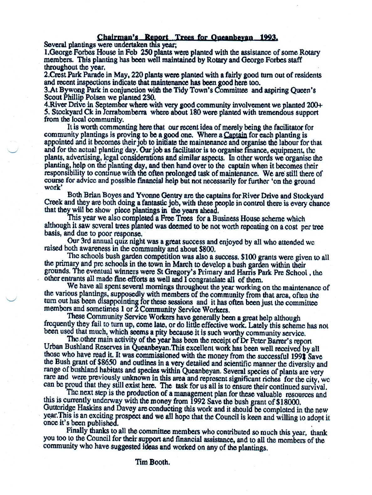 On 2 Dec 1992 newspaper reported that Trees for Queanbeyan, Monaro Conservation Society and Queanbeyan council received a grant to employ Dr Peter Barrer as project officer to conduct a survey of remnant bushland areas within the city.
